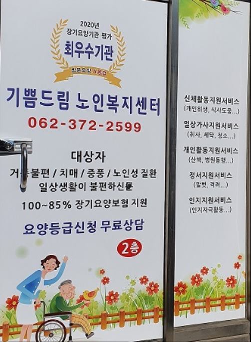 기쁨드림 노인복지센터는 광주 서구 운천로162번길 27 용산상가 2층에 위치한 업체입니다. 우리 센터는 행복한 노년을 위해 방문요양, 방문목욕, 노인돌봄 서비스를 제공합니다. 당신의 일상 생활이 어려운 장기요양등급 1~5등급 어르신과 노인 돌봄이 필요한 대상자에게 행복한 동반자가 되어드리겠습니다. 우리 센터는 돌봄받지 못하는 사각 지대 어르신도 어른(어르신)들에게 돌봄 서비스를 제공해 줄 수 있습니다. 우리 센터는 어르신들을 위해 최선의 서비스를 제공하고 있습니다. 우리와 함께 행복한 노년을 즐겨보세요. 우리 센터 주소로 언제든지 방문해 주세요.