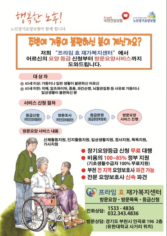 서울 구로구 경인로에 위치한 효방문요양센터는 도움이 필요한 어르신들을 위해 요양보호사를 파견 지원하는 센터입니다. 저희 센터에서는 장기요양보험을 통해 비용을 국비로 85%~100% 지원해 드립니다. 또한, 장기요양등급을 받을 수 있도록 무료로 등급 신청을 도와드립니다. 지역 사람들에게 소중한 서비스를 제공하기 위해 최선을 다하고 있습니다. 어르신들의 안녕과 행복을 위해 효방문요양센터가 함께할 수 있도록 도와주세요.