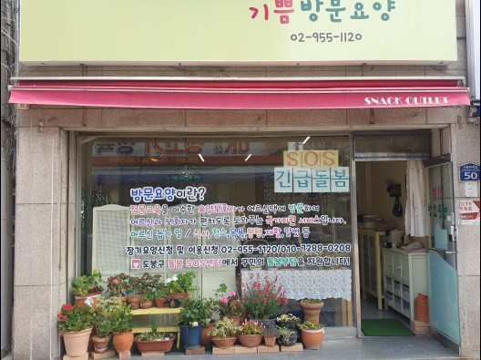 기쁨방문요양센터는 서울 도봉구 도봉로145길 50 1층에 위치하고 있습니다. 방문요양이란 일상생활이 불편하신 어르신을 대상으로 요양사가 집에 방문하여 가사활동, 신체활동, 정서활동 등을 도와주는 국가지원 서비스입니다. 대한민국 국민 모두는 노인장기요양보험의 적용을 받으며, 어르신의 상태에 따라 월 주5~6회 1일 3시간씩 방문요양, 방문목욕, 방문간호 서비스를 제공합니다. 우리 동네에 있는 어르신과 그 가족들에게 소중한 도움이 될 수 있도록 최선을 다하고 있습니다. 우리 센터로 연락 주시면 친절하고 전문적인 서비스로 보답해드리겠습니다.